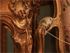 Schloss Solitude is a pleasure palace built by Duke Carl Eugen in the late Rococo period, and contains one of the first examples of trompe l'oeil wood ever used in European architecture. The imitation of nature, in the belief that artifice could make nature better than nature itself, was typical of the late Rococo. Constant play with figure, ground, and false perspective, through trompe l'oeil and the use of mirrors, was another important facet of the aesthetic. The ornate design of the Schloss extended at the time into the forest surrounding it, which was originally intended as a vast hunting preserve stretching between and used by the castles of several different aristocrats in the area. An elaborate garden was planned, though never completely finished, just behind the Schloss, while the existing nature behind it was re-configured to accomodate the Duke's amusements, with grottos, paths, clearings and orchards planted into the forest in preparation for costume parties, and a system of artificial lakes dug into the hills for an annual gondola procession.