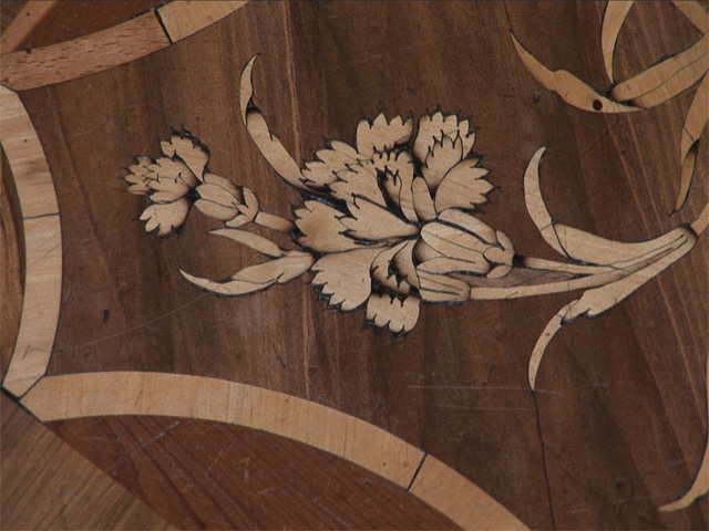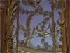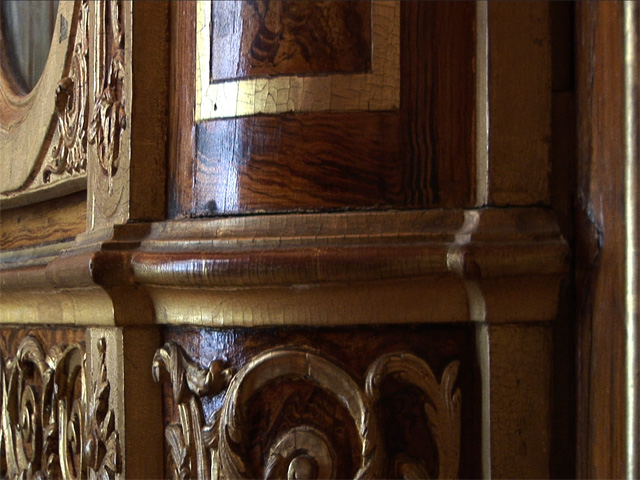 Schloss Solitude is a pleasure palace built by Duke Carl Eugen in the late Rococo period, and contains one of the first examples of trompe l'oeil wood ever used in European architecture. The imitation of nature, in the belief that artifice could make nature better than nature itself, was typical of the late Rococo. Constant play with figure, ground, and false perspective, through trompe l'oeil and the use of mirrors, was another important facet of the aesthetic. The ornate design of the Schloss extended at the time into the forest surrounding it, which was originally intended as a vast hunting preserve stretching between and used by the castles of several different aristocrats in the area. An elaborate garden was planned, though never completely finished, just behind the Schloss, while the existing nature behind it was re-configured to accomodate the Duke's amusements, with grottos, paths, clearings and orchards planted into the forest in preparation for costume parties, and a system of artificial lakes dug into the hills for an annual gondola procession.