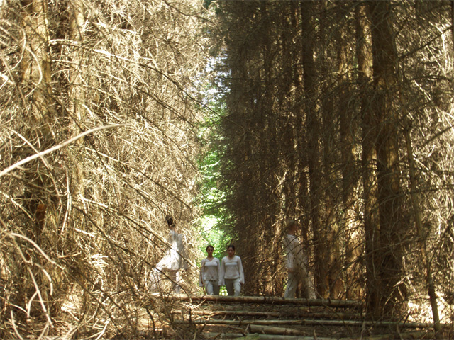 Fugitive Refrains is a video conceived and produced collaboratively by media artist Mariam Ghani and Butoh-trained dancer/choreographer Erin Kelly during a residency at Akademie Schloss Solitude in Stuttgart, Germany. It was developed for, performed, and shot on HDV in six specific sites in the Solitude Rotwildpark forest in summer 2006, and will premiere at the Akademie in spring 2007.
